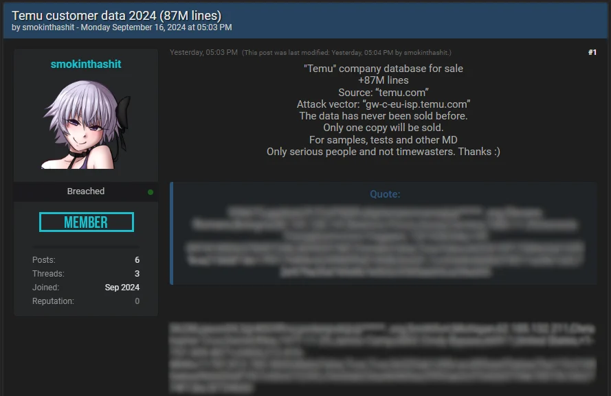 A Temu tagadja, hogy feltörték volna, vagy adatszivárgást szenvedett volna, miután egy hacker azt állította, hogy 87 millió ügyfél adatát tartalmazó adatbázist árul a BreachForums oldalon.