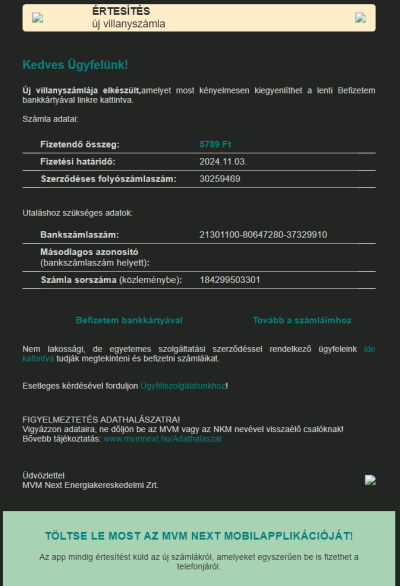 Az MVM már emailben értesít a villanyszámláról és rögtön fizethetjük is – ez persze nem igaz, csak a szokásos adathalász spamről van szó.